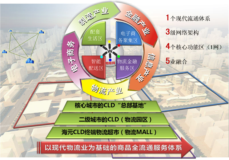 里水物流园其经营模式为全国首创,园区自身不进行具体的物流业务操作,运用专业优势,致力于为进入园区创业的物流企业及相关机构提供配套服务,促使中小企业孵化成长,外地企业落地生根。凡进驻园区的物流企业均可共享研发、生产、经营场地以及资料、信息、网络等设施,获得政策、融资、培训、咨询、技术和市场推广等方面的支持及可能的资金扶持。进入园区,可以大大降低企业的经营风险和成本,提高创业的成功率,使园区成为企业和企业家的成功之地,专线档口变成物流公司的孵化器。并在现代物流产业基础上展开的商品全流通服务体系,简称CLD体系。CLD体系的核心是建立1345架构,即指打造1个商品全流通体系,建设3级架构(核心省城的CLD,二级城市的CLD服务中心,“认证”的县镇CLD终端服务网),形成4大功能根据:三区一网(智能配送区,电子商务聚集区,物流金融服务区,终端服务网络),服务5业融合(物流、金融、制造、电子商务、信息)。