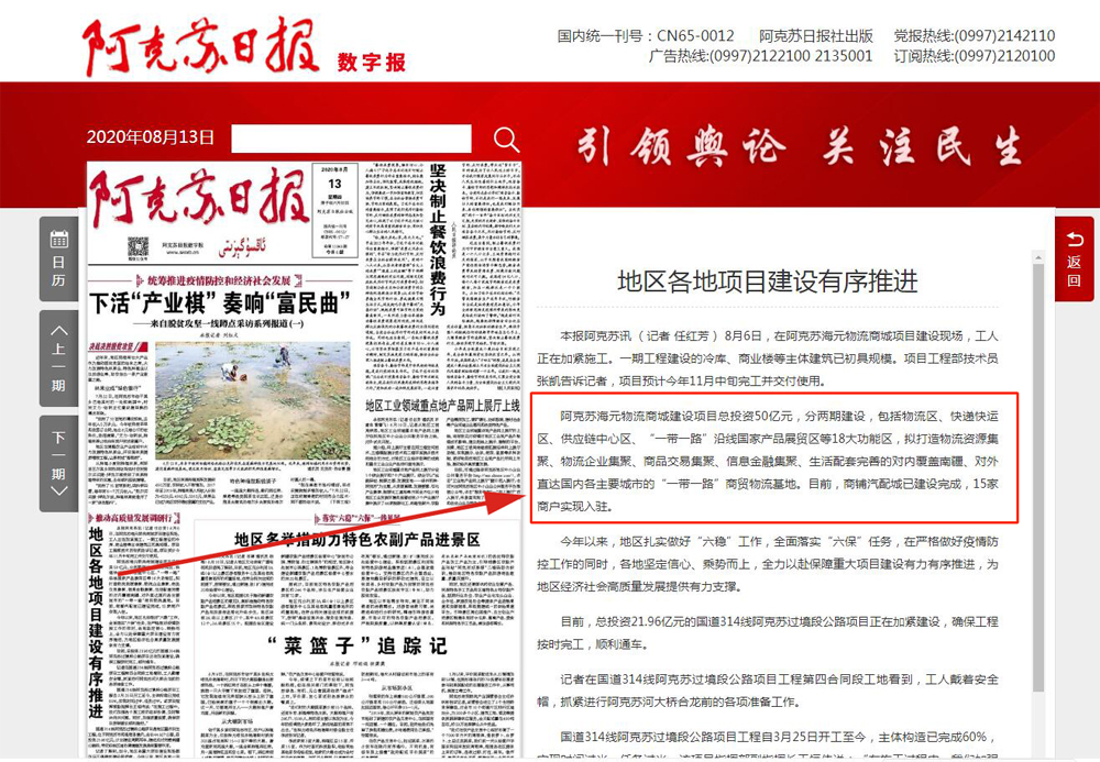 阿克苏海元物流商城建设项目总投资50亿元,分两期建设,包括物流区、快递快运区、供应链中心区、“一带一路”沿线国家产品展贸区等18大功能区,拟打造物流资源集聚、物流企业集聚、商品交易集聚、信息金融集聚、生活配套完善的对内覆盖南疆、对外直达国内各主要城市的“一带一路”商贸物流基地。目前,商铺汽配城已建设完成,15家商户实现入驻。