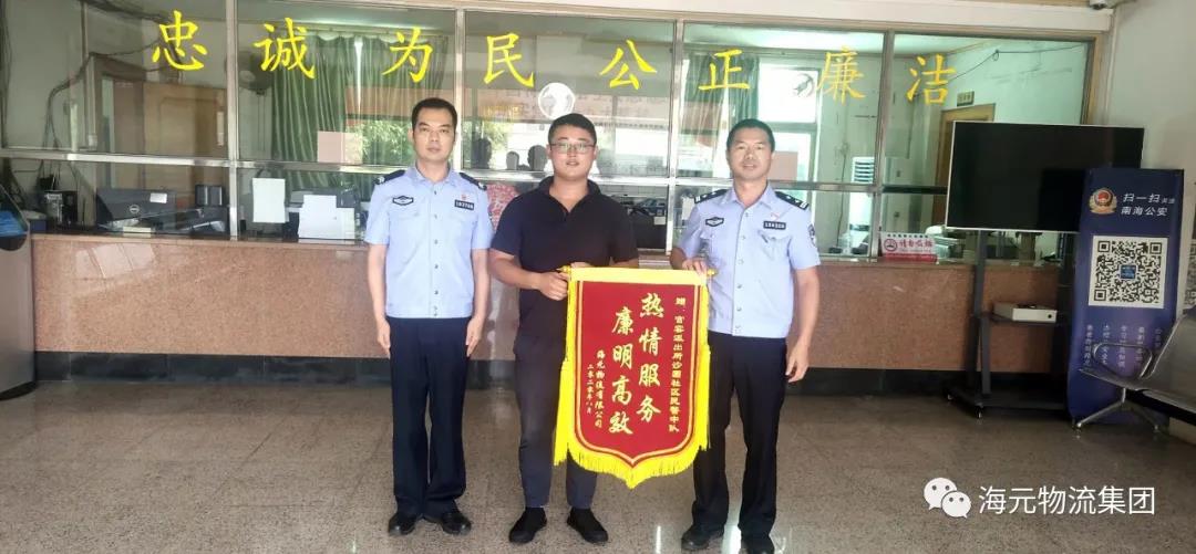 日前,狮山海元物流商城园区总经理朱江波一行来到官窑派出所沙圃社区民警中队,亲手送上一面写有“热情报务,廉明高效”的锦旗。朱江波表示:自在园区任职以来,官窑派出所沙圃社区民警中队干警不辞辛苦、任劳任怨、冲锋在前,全天24小时始终坚守在联防联动第一线,为维护辖区治安稳定保障海元物流商城正常运转做出了无私奉献,受到园区各企业的一致好评,为此,特赠送锦旗表示衷心地感谢!