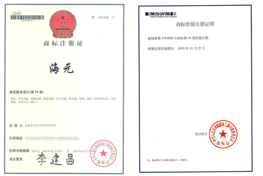 2009年初,“海元”文字商标注册证终于下来了,核定服务项目(第39类),保护范围:货运、汽车运输、铁路运输、船运货物、空中运输、停车场、货栈、递送(信件和商品)、观光旅游、商品打包等(至2019年,公司进行了续展,目前有效期至2029年)。同时,由于业务升级以打造城市产业综合体为目标,构建高品质物流体系,原来LOGO所代表的业务体系已经不具备代表性了,才重新考虑更换新的更有代表意义的标志。